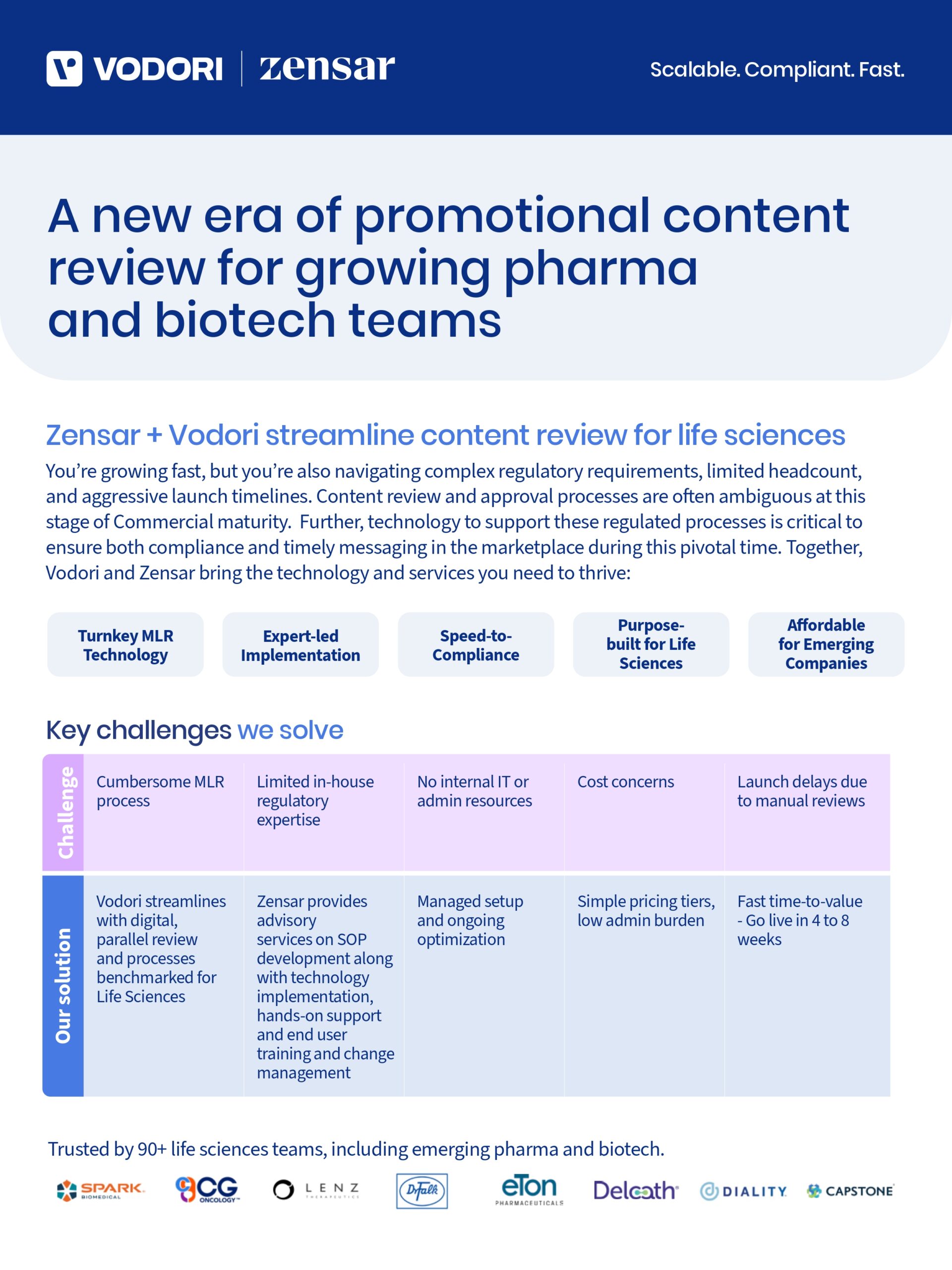 Vodori is cloud-based software that helps life sciences companies bring compliant content to market faster. We help commercial, clinical, regulatory, and quality functions streamline the review, approval, and distribution of promotional, scientific, and medical content. With purposeful innovation and a scalable partnership model, Vodori gives life sciences teams the freedom to compete smarter and reach patients sooner.